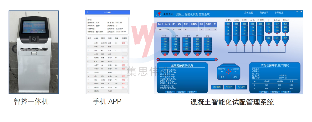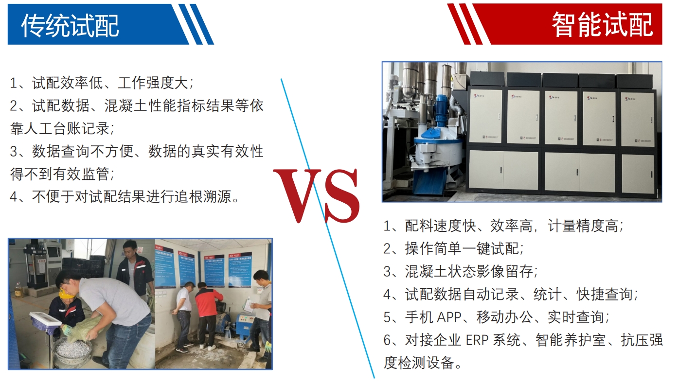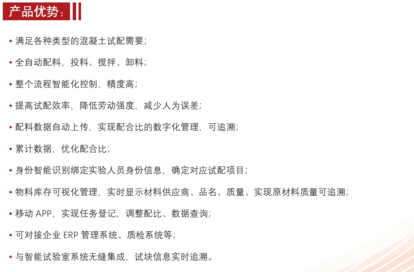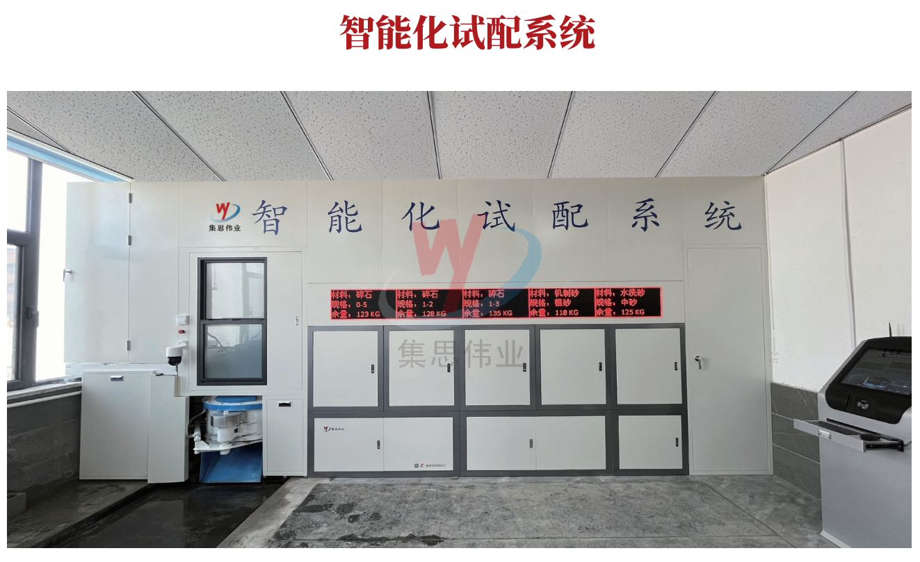 智能化試配系統(tǒng)滿(mǎn)足各種類(lèi)型混凝土試塊試配需求,全自動(dòng)配料,投料,攪拌,卸料整個(gè)流程自動(dòng)化控制!試配效率高!降低勞動(dòng)強(qiáng)度!