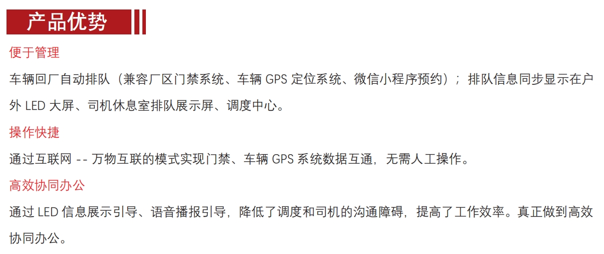 車輛排隊(duì)系統(tǒng)-車輛排隊(duì)信息通過(guò)LED信息展示引導(dǎo),語(yǔ)音播報(bào)引導(dǎo),降低了調(diào)度和司機(jī)的溝通障礙提高了工作效率