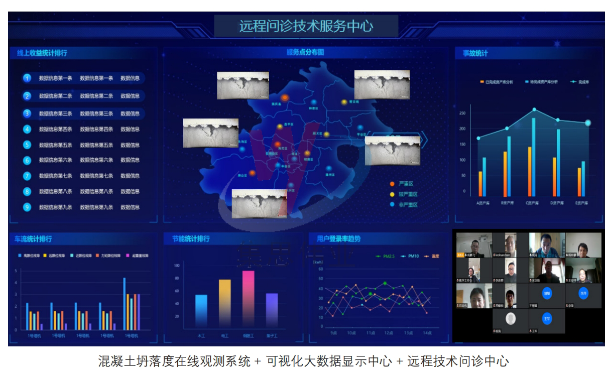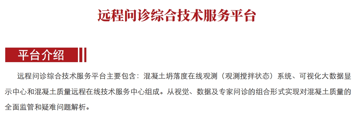 遠程問診綜合技術(shù)服務(wù)平臺主要包含混凝土坍落度在線觀測系統(tǒng)、可視化大數(shù)據(jù)顯示中心,混凝土質(zhì)量遠程在線技術(shù)服務(wù)中心組成。從視覺、數(shù)據(jù)及專家問診的組合形式實現(xiàn)對混凝土質(zhì)量的全面監(jiān)管和疑難問題解析。