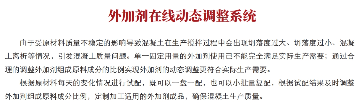 外加劑在線動態(tài)調(diào)整系統(tǒng),根據(jù)原材料每天的變化情況進(jìn)行試配,既可以一盤一配,也可以小批量復(fù)配,根據(jù)試配結(jié)果及時(shí)調(diào)整外加劑組成原料成分比例,確保混凝土生產(chǎn)質(zhì)量